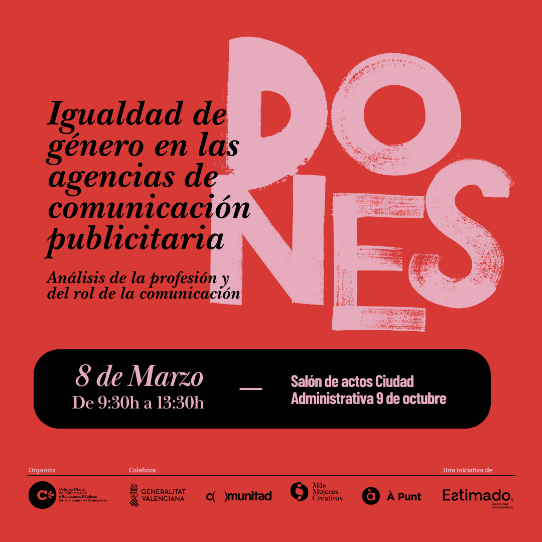 El Colegio de Publicitarios y Relaciones Públicas de la Comunitat Valenciana ha organizado el pasado 8 de marzo esta iniciativa de la Agencia Estimado en colaboración con la Generalitat Valenciana, À Punt, Más Mujeres Creativas y ComunitAD. Dones es un evento pionero organizado por el sector de la comunicación, la publicidad y las relaciones públicas que se enfoca en analizar, entender y reflexionar sobre cómo comunicadores y publicitarios/as pueden influir positivamente en la igualdad de género dentro del sector.